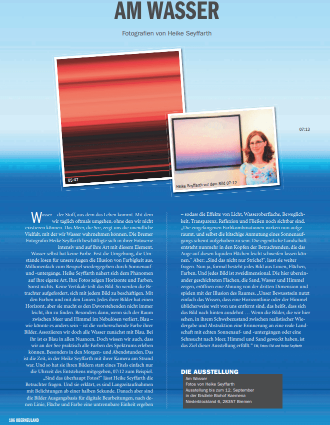 Durch geringe, aber gezielte Manipulationen am Computer wurde die formale Ähnlichkeit der ursprünglichen Horizont-Bilder verstärkt, so dass Linie, Fläche und Farbe eine untrennbare Einheit ergeben. Die Landschaft entsteht im Kopf der Betrachtenden.