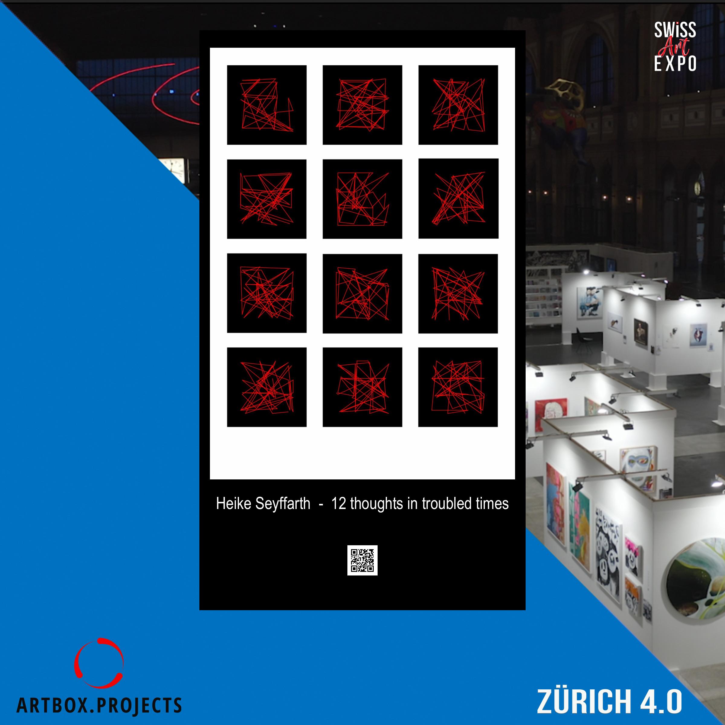 Ich freue mich, auch in diesem Jahr wieder mit dem ARTBOX.PROJECT bei der Swissartexpo in Zürich dabei zu sein. Dort zeige ich das Werk „Twelve thoughts in troubled times“ – „Zwölf Gedanken in unruhigen Zeiten“, in dem ich versuche, die aktuellen Wege und Irrwege meines Denkens zu visualisieren. Einige Gedankegänge kommen nach Umwegen wieder an ihrem Ausgangspunkt an, während andere nach zahlreichen Wendungen im Unbestimmten enden. Bemerkenswert sind Kreuzungen mit prominentem Deja-Vu-Gefühl sowie zentrale Punkte verdichteten Vorbeikommens.